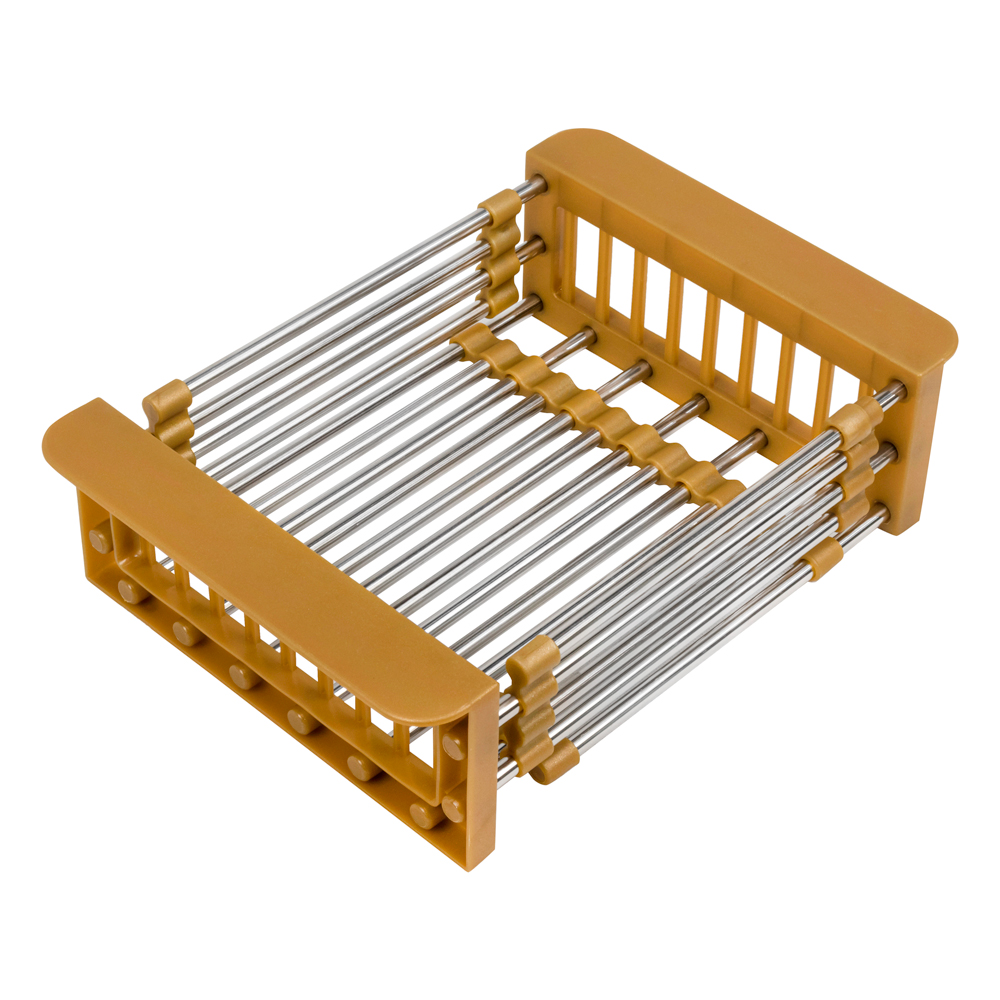 Коландер раздвижной для мойки изготавливается из нержавеющей стали и ударопрочного пластика, который минимизирует возможность повреждения поверхности мойки.